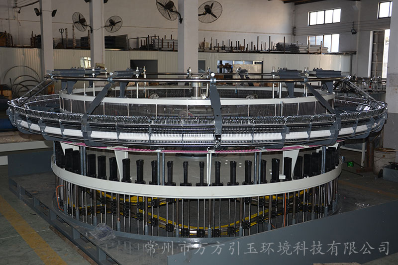 圓織機的經紗架上有有許多紗錠,依據編織布幅寬和扁絲寬度,使用規定范圍數量的經紗.經紗進入圓織機前,由經紗的棕框對經紗進行交叉開口,緯紗梭子在交叉開口中作圓周運動穿過經紗,編織成筒布. 一臺圓織機有幾把梭子,就有幾條緯紗同時織入.對于平織布,可用平織機,片梭織機,噴水織機編織.